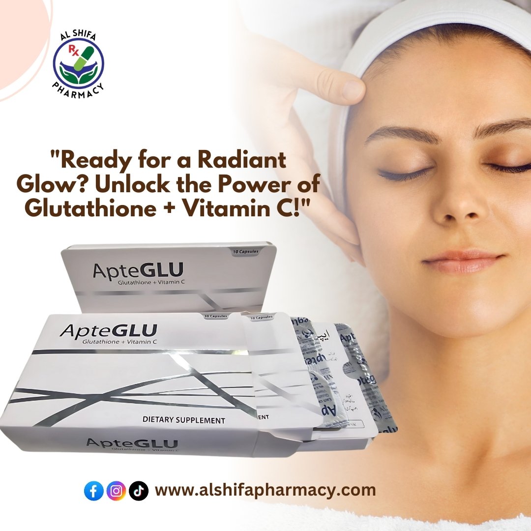 Alshifa Pharmacy delivers 100% original ApteGlu Glutathione + Vitamin C Capsules (30 count) with secure packaging and nationwide fast delivery. Also available at Alshifa Medix. Order now and experience the power of natural skin radiance and immune wellness!