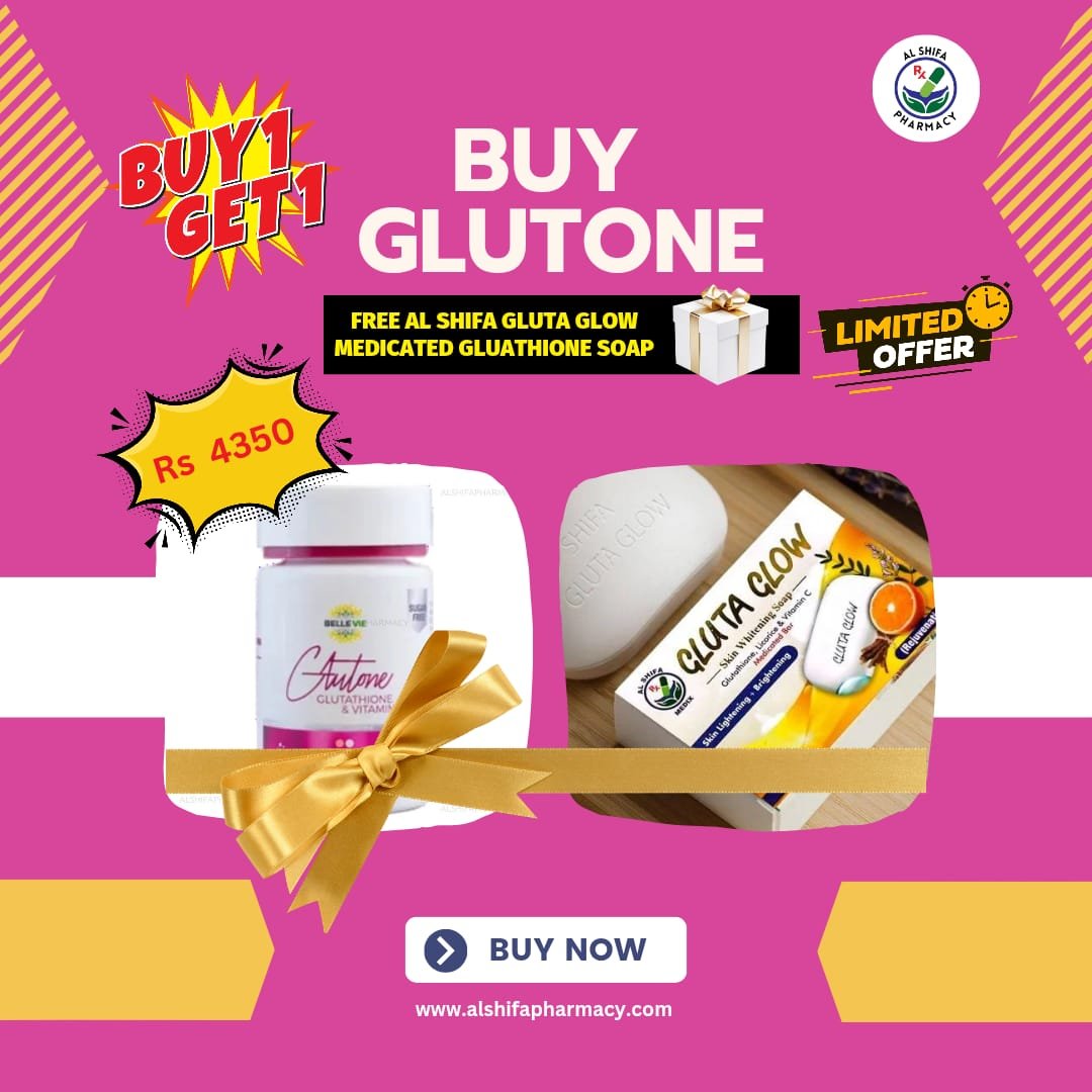 The Glutone + FREE Gluta Glow Medicated Soap Bundle offers a complete skin whitening and care solution. While Glutone Tablets work internally to detoxify and brighten your skin, the medicated soap enhances external care by cleansing, moisturizing, and evening out your complexion.