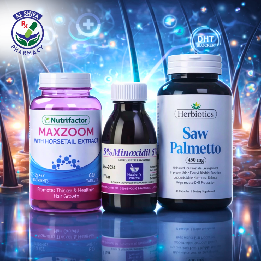 Hair fall and thinning hair can affect confidence, appearance, and overall self-esteem. If you are looking for a powerful hair regrowth combo in Pakistan, the combination of Nutrifactor Maxzoom + Minoxidil Plus Finasteride Spray + Herbiotics Saw Palmetto is one of the most effective hair support solutions available.